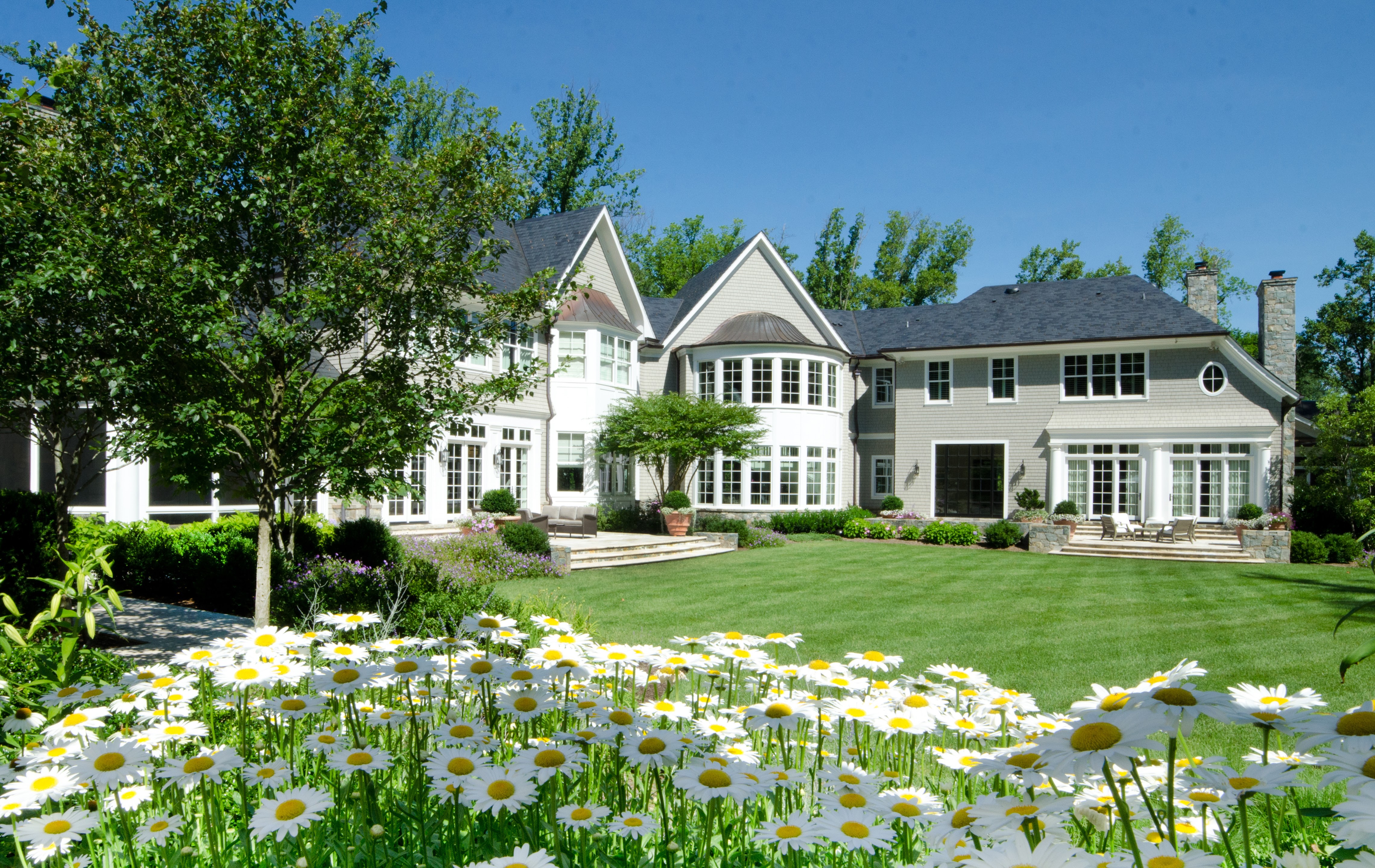 Leading to the arrival court, a gravel drive meanders through the property and continues to the classic porte-cochère. A formal cocktail terrace welcomes residents and guests to enter the peaceful setting of the outdoors from the dining room. This terrace includes a small pond and overlooks the expansive front lawn with its strokes of soft colors and plantings. The rear terraces step out to a formal lawn with a beautiful bench positioned as the focal point. An allée aligned with the front entrance creates the path to the pool terrace and pool house where there is plenty of informal space to cook, entertain, relax, and take in the natural surroundings.